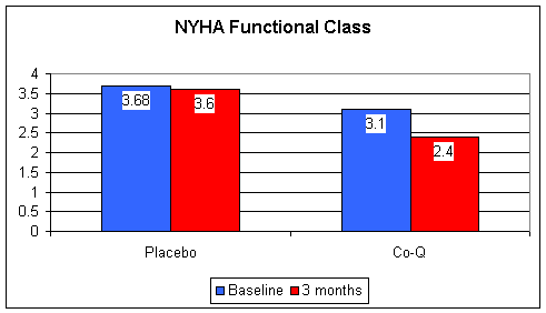 New York Work Functional Class ranges from Class I (symptoms only with strenuous exercise) to Class IV (symptoms at rest). There was no significant change with placebo therapy while Functional Class improved with Co-Q treatment.