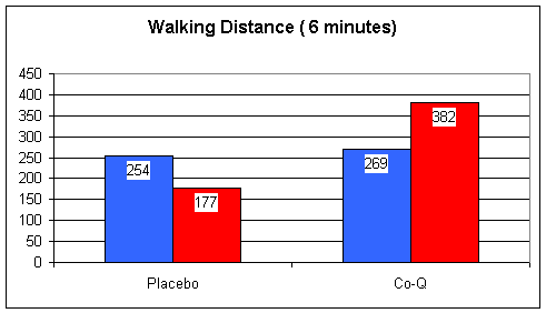 How far the patients could walk in 6 minutes, a practical measure of functional status, deteriorated with three months of placebo therapy but improved on Co-Q10.