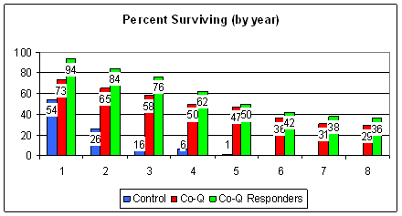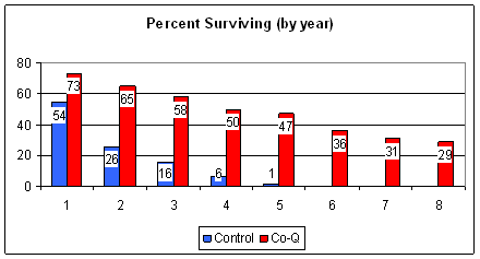 180 patients with class IV CHF were randomized to receive, over 8 years, Co-Q10 100 mg/day plus usual therapy vs. usual therapy alone. These were very sick patients. All had required at least two hospital admissions with CHF over the preceding year, their ejection fraction was below 30% (mean EF was 20%), and all were doing poorly on conventional drug therapy. The charts below present survival data: