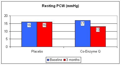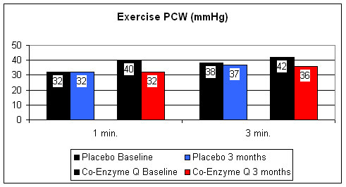 Twenty two patients with Class II-IV CHF underwent right heart catheterization and bicycle stress studies at baseline and following three moths supplementation with placebo or CoQ10, in a fat soluble preparation at a dose of 100 mg twice a day. Blood Co-Q levels rose from 1.1 to 3.3, consistent with adequate supplementation. Treatment results are presented in graphic form below: The PCW (Pulmonary Capillary Wedge Pressure) is the blood pressure experienced by the lungs. As heart pumping function falls, the wedge pressure will rise, and you will experience shortness of breath. The patient with Class III CHF has to stop walking at one block because his wedge pressure has increased; if he kept walking his lungs would flood with blood. Any therapy that decreases wedge pressure or that blunts the rise in wedge pressure that would otherwise occur with exercise would be expected to improve functional capacity. The wedge pressure fell with CoQ supplementation. The second graphic is difficult to interpret. Basically it shows that the rise in wedge pressure that occurs with exercise is blunted with CoQ supplementation.