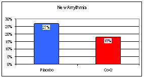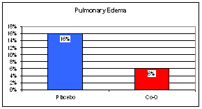 Co-Q helps keep you out of the hospital; admission rate was 40% on placebo and 20% on CoQ10. The nature of the hospital admissions was also affected in a favorable fashion, with less CHF (cardiac asthma), less pulmonary edema (severe CHF) and less new onset arrhythmia.