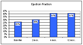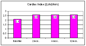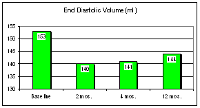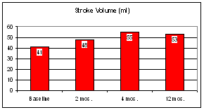 Heart chamber size (end diastolic volume) decreased, stroke volume (the amount of blood pumped forward with each heart beat) increased, as did ejection fraction (the percentage of blood that fills the heart that is pumped forward). Cardiac index, a measure of pumping function, improved as well. Survival in class IV CHF at this time was 50% at one year. These patients, who received Co-Q10 along with then standard therapy, did much better.