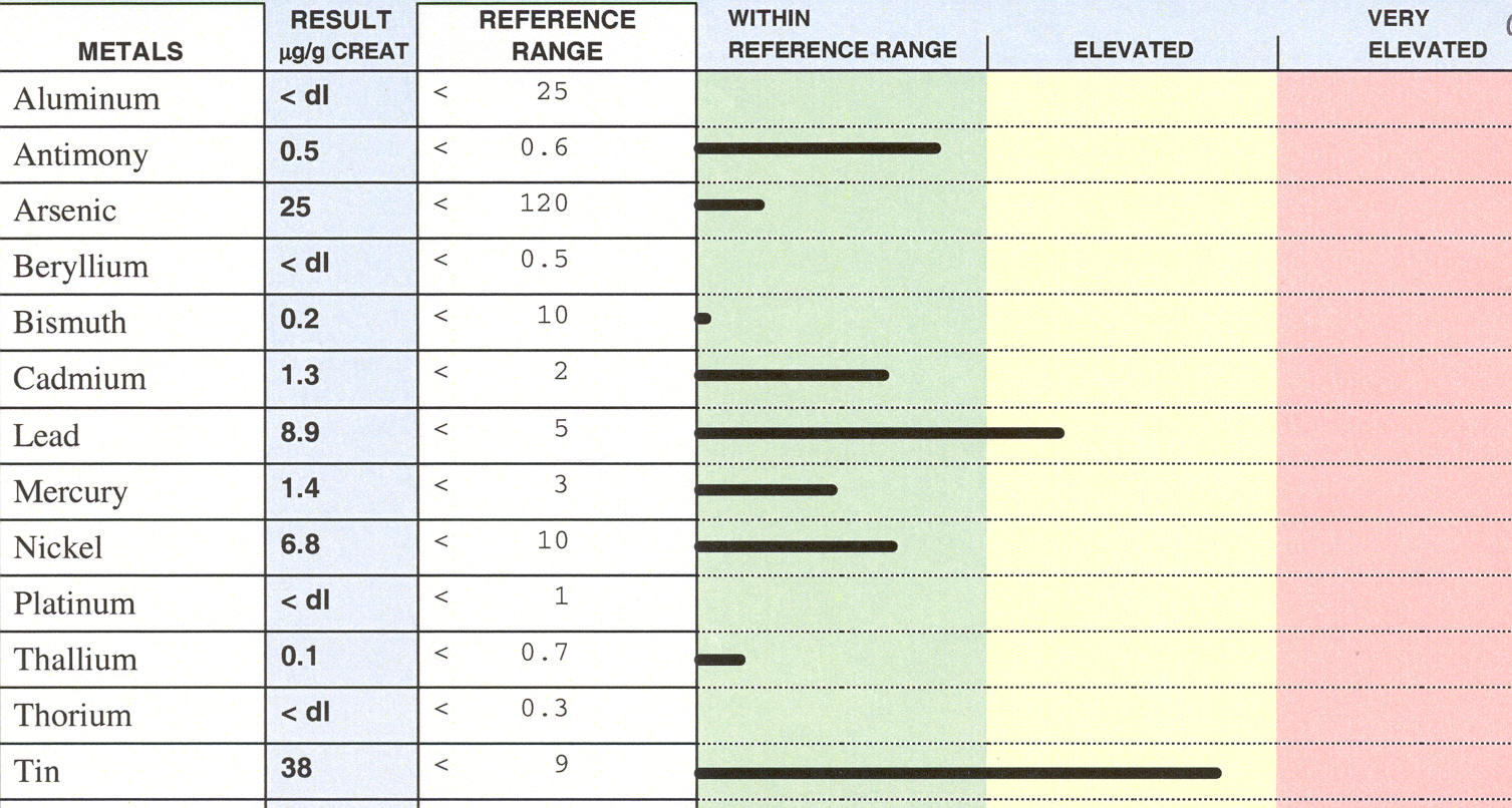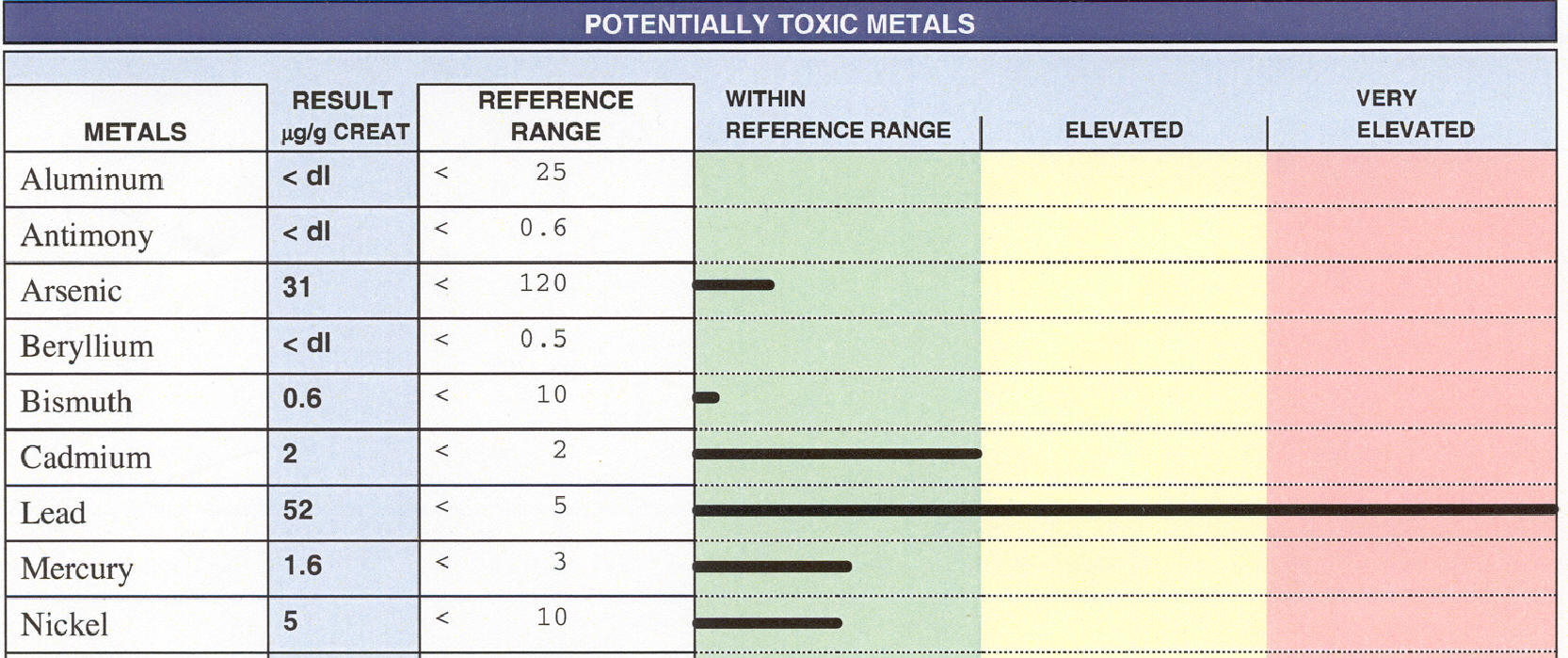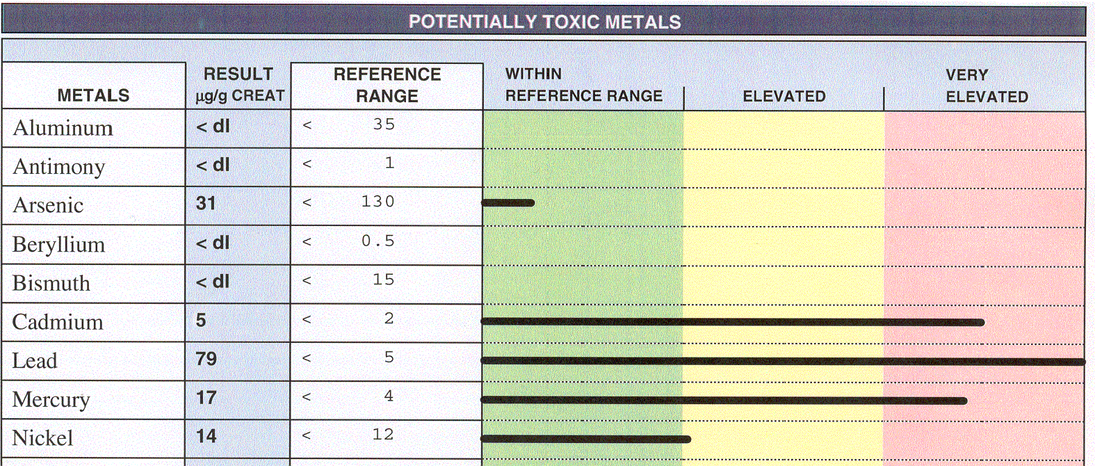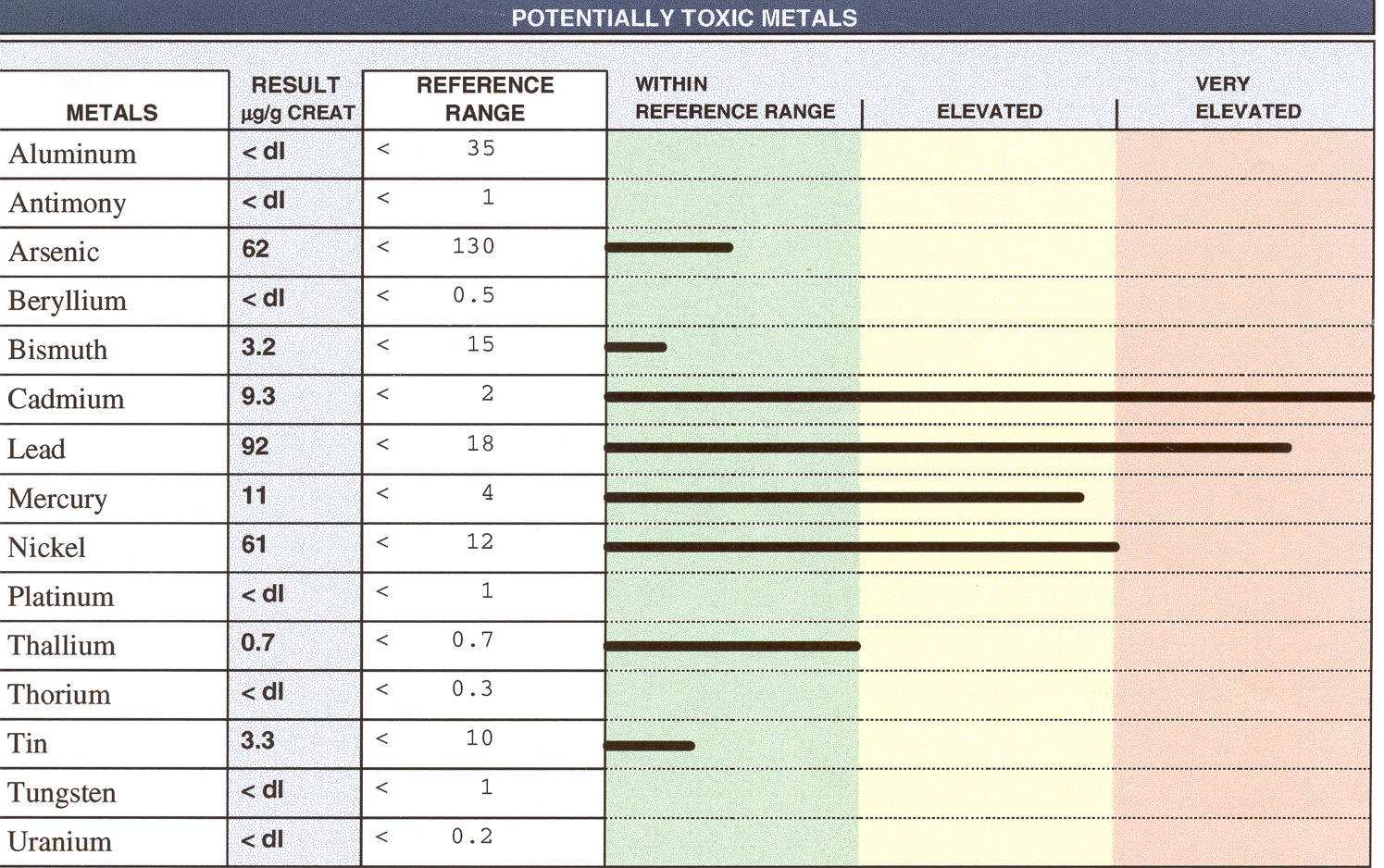 There was really no reason for RH to have a cardiac arrhythmia, nor was there a specific reason for RH to be so sensitive to drug therapy. She didn't smoke, her blood sugar was normal, and she followed a good diet; she wouldn't let me carry out a stress test but she had never experienced chest pain suggestive of coronary disease. When things don't make sense, when patients present with disease states they shouldn't have, I think of toxicity, especially heavy metal toxicity. HR's Mercury amalgam fillings had been removed years earlier, but a challenge study carried out in 2000 revealed a moderate urine Mercury spill, indicating the presence of Mercury in her tissues.