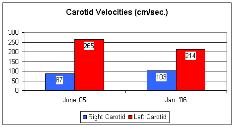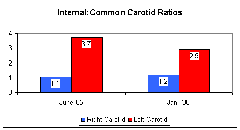 The Internal Carotid Artery, which serves the front of the brain, arises from the Common Carotid Artery in the neck. Another measure of Internal Carotid disease severity is the velocity ratio between the Common and Internal Carotid on the same side. In BR's case the ratio fell significantly on the left and rose only minimally on the right.