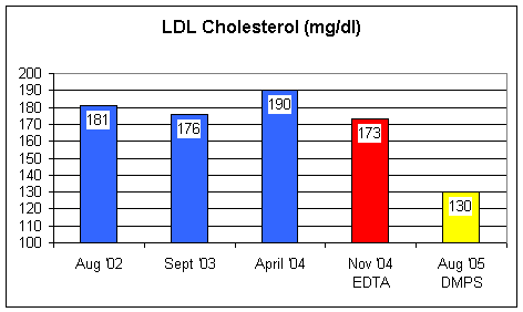 KD tolerated DMSA well. Six months later his echo looked better - the left ventricle was smaller, the diastolic (resting) size of his left ventricle had decreased from 6.4 to 5.6 cm (normal is 5.6 cm or less), and the systolic (contracting) dimension from 4.7 to 4.3). The EPSS, the most reproducible echo marker of pump performance, however, was unchanged at 1.4 (normal is £ 1.0 cm.), and KD's ejection fraction remained low at 30-35% (normal is 50%). KD kept up with DMSA based metal detoxification - his echo was repeated at the one year point (June '06), and further improvement was noted. The stage was now set for KD to undergo MME. DMSA had begun to remove metals from KD's heart (and elsewhere in his body). The next step was MME, aiming to drive more metal out of KD's heart and to improve cardiac function (we feel that MME increases intracellular energy production and stimulates proliferation of local stem cells - discussed elsewhere on this site). Stem Enhance (mobilizes uncommitted bone marrow stem cells out in to the circulation, from there to "land" in organs that need repair and regeneration) was begun concomitant to MME; DMSA and KD's nutritional program and Coreg were continued.