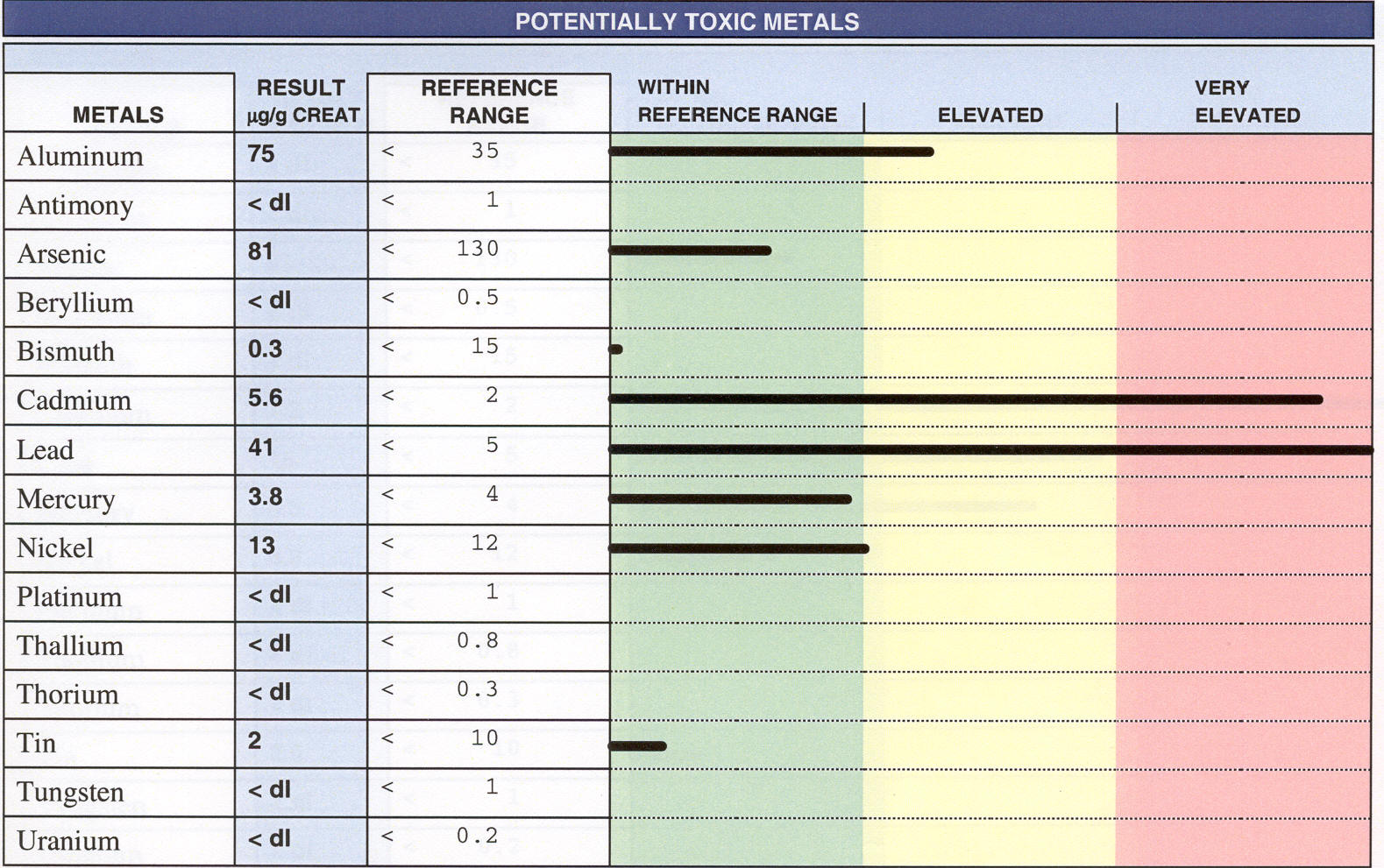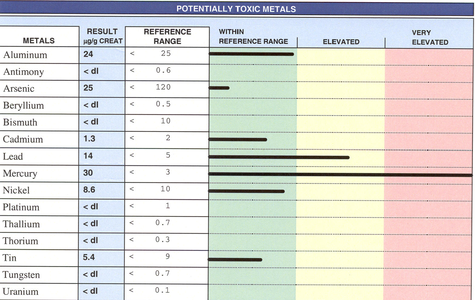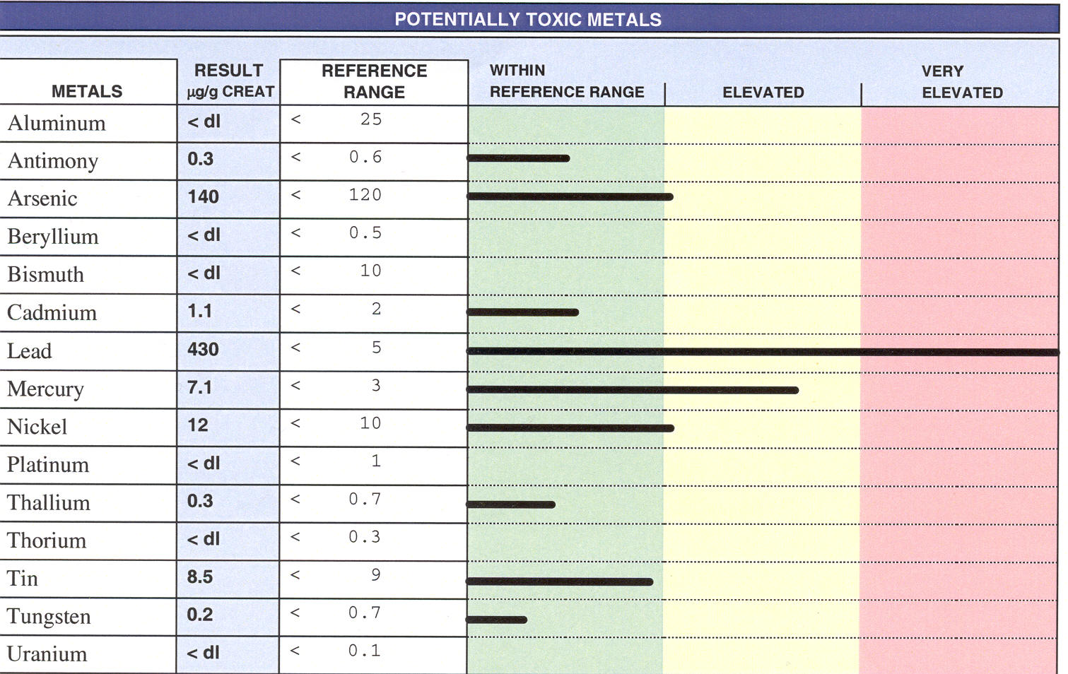 In interpreting the challenge results, please understand that the findings, the "spills:, reflect not just your body burden of a given metal, but which chelating agent we used, and at what strength it was administered (discussed elsewhere on this site). The "within reference range", elevated", and "very elevated" ranges refer to non-provoked urine metal levels. The challenge results depict provoked levels, so don't become overly alarmed when your results are in the "elevated range". We use the non-provoked parameters because there are no standardized "normal" or "abnormal" ranges for provoked specimens. We need to remember that a truly normal level for a toxic metal would have to be zero, non-detectable.