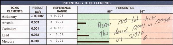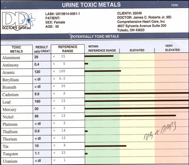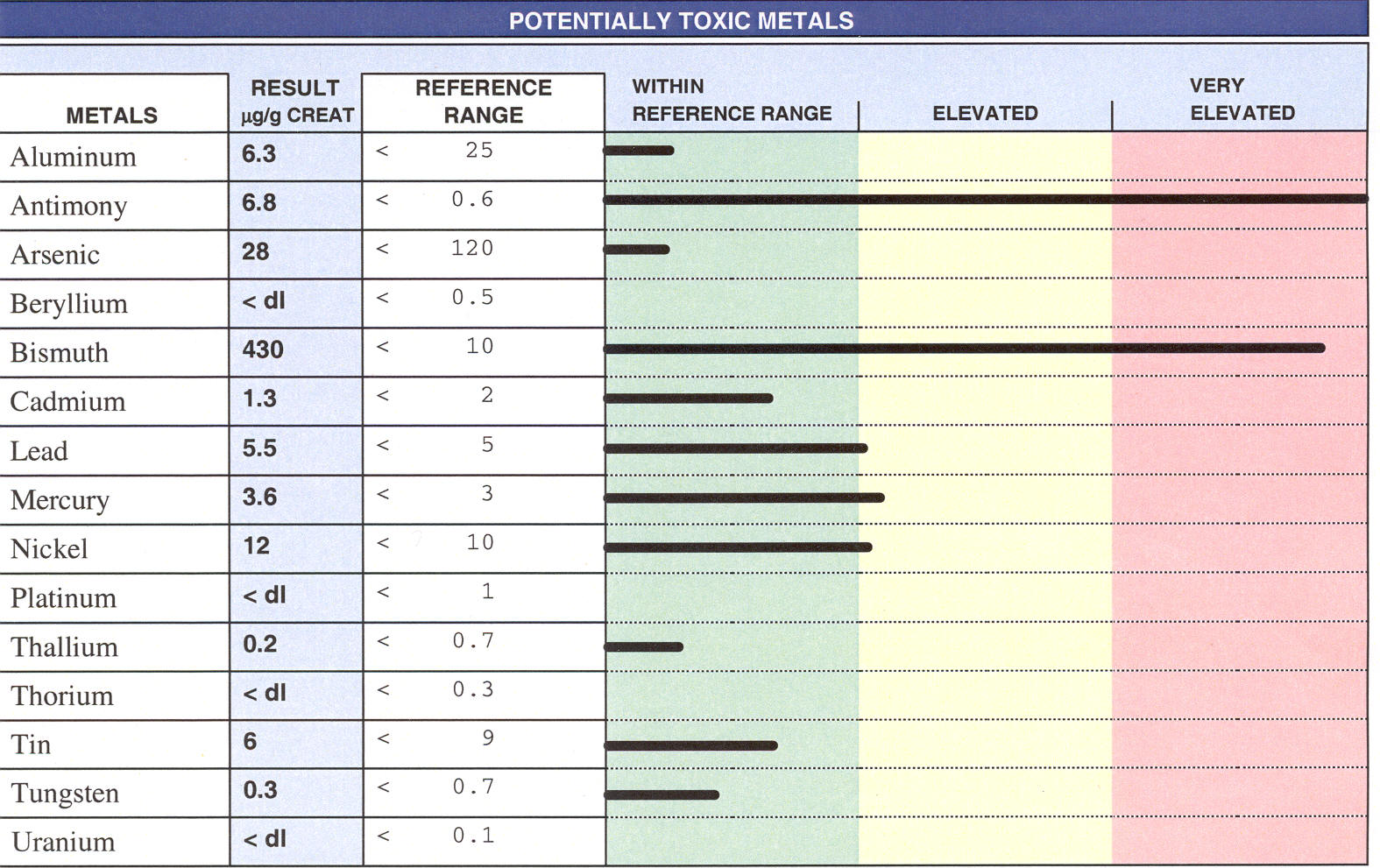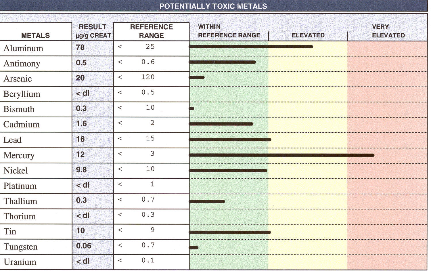 In interpreting the challenge results, please understand that the findings, the "spills:, reflect not just your body burden of a given metal, but which chelating agent we used, and at what strength it was administered (discussed elsewhere on this site). The "within reference range", elevated", and "very elevated" ranges refer to non-provoked urine metal levels. The challenge results depict provoked levels, so don't become overly alarmed when your results are in the "elevated range". We use the non-provoked parameters because there are no standardized "normal" or "abnormal" ranges for provoked specimens. We need to remember that a truly normal level for a toxic metal would have to be zero, non-detectable.