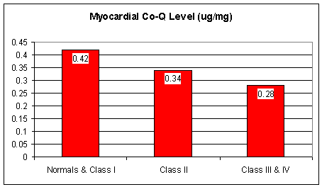 Co-Enzyme Q10 levels in blood and heart tissue (myocardial cells obtained from a catheter biopsy) were obtained from normal individuals and from patients with Class I (essentially asymptomatic) through Class IV (symptoms of heart failure at rest) cardiomyopathy. As you can see, as the severity of heart failure increases, heart muscle Co-Q levels fall. Blood Co-Q levels fall in tandem. This makes sense, as the heart is the greatest consumer of Co-Q in the body. The still viable cells of the failing heart run out of Co-Q, as they are overworking, trying to make enough ATP to generate a normal cardiac output. Without Co-Q, however, they are overworking in vain, as without Co-Q, ATP cannot be generated from the energy stored in sugar and fat, so heart function continues to deteriorate. Heart failure and Co-Q deficiency go hand in hand. Heart failure can cause Co-Q deficiency, and Co-Q deficiency can cause heart failure