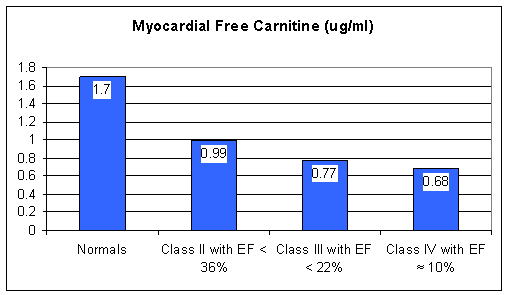 These and other studies have shown that Co-Q deficiency is associated with heart disease, and that heart disease is associated with Co-Q deficiency. The chart to your left shows that the same principle holds with Carnitine; the worse the CHF, the lower the myocardial Carnitine level. Similar relationships have been shown for other nutrients involved in cardiac energy metabolism. Conversely, bioenergetic supplementation has been shown to increase blood and myocardial levels of Co-Q and Carnitine in the patient with CHF or coronary insufficiency. Energy metabolism is improved, and with this we see an improvement in cardiac performance (in the studies, average ejection fraction will rise or heart chamber size decreases), while symptoms will lessen (exercise capacity increases and NTG requirement falls).