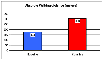 In a treadmill study, patients with coronary disease received either placebo or carnitine 900 mg/day over 12 weeks. Nothing happened with placebo therapy, while in the carnitine group treadmill walking time increased by 12%, from 11.4 to 12.8 minutes, and time to ST depression was prolonged by 37%, from 6.4 to 8.8 minutes.