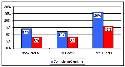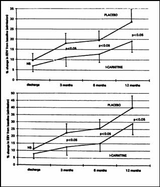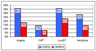 In this study 472 consecutive patients presenting with a heart attack involving the anterior wall of the heart were randomized to receive carnitine 6,000 mg/day or placebo over their first year post-heart attack. An echo study was carried out at hospital discharge and then periodically thereafter.