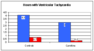 56 patients presenting with heart attack were randomized to receive IV placebo or IV carnitine at a dose of 100 mg/kg twice a day over three days, with continuous monitoring of cardiac rhythm:.