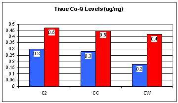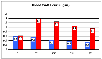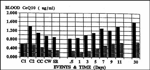 Blood CoQ10 levels rose with supplementation. In the charts below, C1 refers to the CoQ10 level at the time of angiography, carried out two weeks before bypass surgery. C2 refers to the CoQ10 level at the time of surgery. CC refers to events occurring during surgery, when the heart is "on ice", CW to the immediate post-op state, as the heart is being removed from bypass, and SR to events occurring in the post-op surgical recovery room.