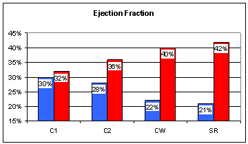 Heart tissue levels were not obtained at C1, at the time of the coronary angiogram, but they were obtained at three time points during bypass surgery, and you can see that oral CoQ10 supplementation increased the content of CoQ10 within the heart tissue, and second, that the stress of surgery depleted heart tissue CoQ10 in the placebo treated patients, but less so in the supplemented group. The goal of bypass surgery, as well as the goal of everything anyone in cardiovascular medicine attempts to do for you, is to increase the content (and your ability to regenerate) ATP within the cells of the heart. With just two weeks of supplementation, heart ATP levels rose with supplementation. This is a critical piece of science. How would you like to be going into a high risk surgery, in the high cardiac ATP content group, or with low ATP because your care was confined to drug therapy alone? ATP levels actually fell during bypass surgery (a situation that can be blunted with Ribose, discussed elsewhere on this site), but they fell a lot less in the surgical patients who were treated with CoQ10. The heart needs energy, ATP energy, to pump effectively, so what effect did CoQ10 supplementation have on ejection fraction, the percentage of blood filling the heart that is actually ejected forward with each beat?