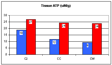 CoQ10 levels rose between C1 and C2 in the supplemented (red) group, but remained low in the placebo (blue) group, not a surprise. The on-treatment level of 1.4 isn't optimal, but it's all you are going to get with just two weeks of supplementation. In both groups, the blood CoQ10 level fell with the stress (free radical, inflammatory, nutritional, and ischemic stress) of surgery, but it fell a lot less in the supplemented group. C0Q10 blood levels rebounded during the 30 day recovery period, but obviously much faster, and to a greater degree, in the supplemented group. This all makes sense, but what effect did oral supplementation have on heart tissue CoQ10 levels? What effect did this have on cardiac energy production?