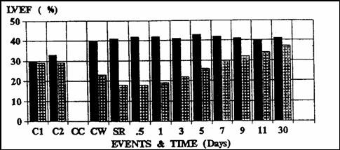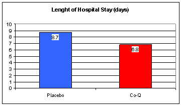 Ejection fraction falls as a direct consequence of bypass surgery, related directly to the loss of ATP that accompanies this procedure. This is why patients may struggle in the surgical recovery room, even thought the surgery was a technical success. This temporary loss of heart tissue ATP leaves you with a stiff, poorly contractile heart; thus you may require diuretic therapy to clear fluid from your lungs, or inotropic (adrenaline like agents that stimulate the heart to pump harder) therapy for a period of time. If blood flow to the kidney falls off, temporary dialysis may be required. But if you are treated with CoQ10, ATP levels don't fall as much, your ejection fraction doesn't fall; rather it rises by the time you hit the recovery room, and it remains higher than in non-supplemented patients during your entire hospital stay. So what affect does all this have on your outcome?