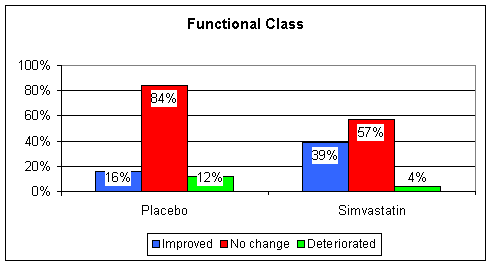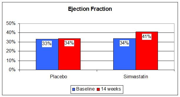 So cholesterol is protective, but its intermediates, intermediates blunted by statin therapy, are deleterious. Statin therapy also lowers Co-Enzyme Q10 levels by 50% (Co-Enzyme Q10 is manufactured along the same path as is cholesterol). Co-Enzyme Q10 deficiency can cause CHF, and supplementation is therapeutic. On one hand, in theory, statin therapy should help in CHF, while on the other it should hurt. What happens in reality? Let's find out. In one study patients with symptomatic CHF and an average ejection fraction of 33% (normal is 50-55%), nearly all of whom were on b-blockers, ACEIs, Digoxin, and a diuretic, were randomized to receive Simvastatin (trade name Zocor) 10 mg/day or placebo in double-blind fashion. The Zocor group did better. TNF, Interleukin-6, and B-Natriuretic Peptide levels fell while endothelial function improved. Functional class and ejection fraction improved.