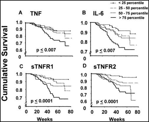 Pentoxifylline for TNF Blockade - CHF is an inflammatory condition. Patients will be red in the face; their pulse rate is often elevated and sometimes they will run a temperature. Patients with advanced heart failure will appear wasted, as if they had a tumor. We have observed that patients in active CHF appear as if they are infected, but what could infection have to do with CHF, a disease of the heart and circulation? We do know that infection can damage the heart; bacteremia (bacteria in the blood stream) lowers the ejection fraction. It's not the infection itself that compromises cardiac function, rather it is the immune system's inflammatory response to infection, any infection, that damages the heart. All of the inflammatory mediators that rise in infection (Interleukin-6 and C-Reactive Protein, to name a few) can damage the heart and the vasculature. Tumor Necrosis Factor-Alpha, referred to as TNF, is the most important offender. The presence of bacteria or bacterial cell membrane components within the circulation leads to the elaboration of TNF, which in turns stimulates an inflammatory immune response to kill the invading organisms. TNF also damages the heart, causing the myocytes to falter and then to commit apoptosis (premature cell suicide). During a brief infection, TNF levels are elevated only transiently, and the heart comes through unscathed, while chronic infections are more likely to compromise the heart. Now, consider the issue of fluid retention in the patient with CHF. Fluid retained behind the right heart manifests itself most obviously as ankle edema. What you don't see is congestion in the liver, and in the veins draining the GI tract. Bowel wall edema can impair absorption of the drugs we give you, and it allows bacteria to translocate from the lumen of the bowel, where they cause no harm, into the vasculature, where they illicit an inflammatory response and upregulate TNF production. As CHF is a chronic condition, TNF is chronically upregulated, and heart cells die off. As more and more heart cells die, cardiac pumping function worsens, the degree of CHF and bowel wall edema increases, more bacteria leak in, and down goes the patient. Multiple studies have demonstrated an inverse relationship between TNF levels and functional status and outcome in patients with CHF.