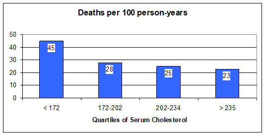Statins for CHF - Statin drugs lower cholesterol, but that is not how they help in atherosclerotic vascular disease, and in CHF they help you despite their cholesterol lowering effect. Actually, there is an inverse relationship between serum cholesterol and mortality in patients with heart failure. Stated otherwise, the lower your cholesterol, the more likely you are to die. Look at the graphic below: