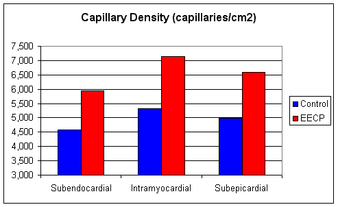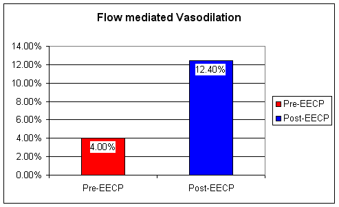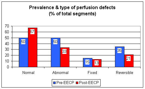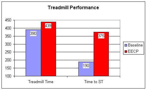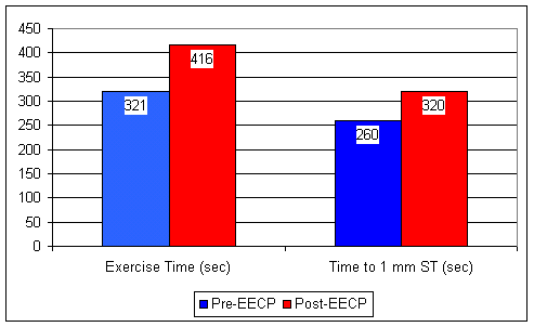 Following an initial symptom limited nuclear stress test, all 18 patients received 35 one hour EECP treatments over a 7 week period. Anti-anginal medications were continued, but per the study protocol the doses could not be increased. Upon completion of EECP, the nuclear stress test was repeated, at the pre-treatment distance. (If the scan was done at 5 minutes of treadmill exercise pre-EECP, the post-EECP scan was carried out at 5 minutes. This way the investigators could see if EECP improved blood flow at a given level of exercise).  A post-EECP symptom limited stress test was also carried out, to determine if treadmill time and exercise capacity would improve.