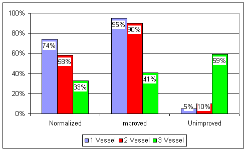It certainly seems that patients with symptomatic coronary disease will benefit from EECP, but which patients will benefit the most?  Will patients with two vessel blockage fare as well as those with single vessel disease?  What happens when all three arteries are blocked? Common sense provides an answer to these questions, but we cardiologists needed a heart catheterization study to see it. Lawson and associates treated 50 angina patients with a standard 35 hour course of EECP.  As in prior studies, stress nuclear scans were performed before and after EECP, to document objectively that an improvement in blood flow had occurred.  A pre-EECP cardiac catheterization was also carried out; the patients were classified as having one, two, or three vessel coronary artery disease, depending on how many arteries were blocked. The point of the study was to determine if the number of vessels blocked could predict which patients would improve the most with EECP. Dr. Lawson's findings are presented in both graphic and table form below.  Before looking at this information, please take a moment to think this over and predict what Dr. Lawson found. Remember that EECP works by recruiting and then enlarging collaterals from a good artery to a blocked artery.