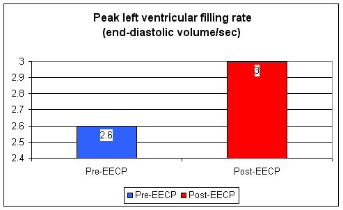 1st, was EECP safe in these heart failure?  As this was a feasibility study, the focus was on safety; oxygen saturation and the patient’s clinical condition were closely monitored over the 844 treatment-hours provided.  46 adverse events were reported in 23 patients; 22 occurred during the 7-week treatment period, and 24 over the 6-month follow-up period.  Of the 46 events, only 14 were classified as serious (led to hospitalization); 1 occurred during the pre-EECP baseline period, 3 during the 7-week EECP program, and 10 during the 6-month follow-up period.  None of the serious adverse events were felt to be treatment-related; rather they were felt to be related to the patient’s underlying cardiomyopathy process.  Of the 22 adverse events that occurred during the 7-week treatment period, 10 occurred during EECP treatment.  Three patients dropped out before 7 weeks; one due to back pain, one due to a flare-up of arrhythmia, and one due to progressive heart failure.  23 of the original 26 patients completed the planned 7 weeks of EECP therapy, and 18 participated in the 6-month follow-up testing.  As adverse events are anticipated in this type of patient, with CHF and severely impaired systolic function, the investigators concluded that EECP can be administered safely in patients with medically addressed CHF, and that properly administered EECP does not aggravate CHF.