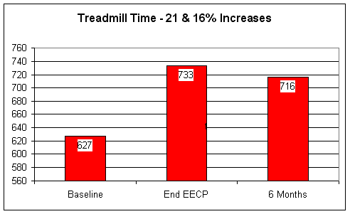 OK, so EECP is safe in heart failure patients, but will EECP help?  First, let’s look at exercise capacity, as measured by the patients' treadmill time and peak oxygen uptake values.  Treadmill time increased by 21%, or just over one minute, following EECP; the effect was fairly well maintained, remaining 16% above baseline at 6 months.