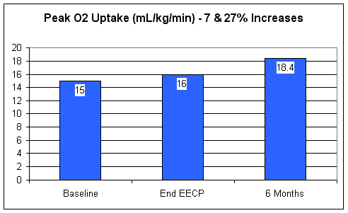 Peak oxygen uptake, perhaps a better indicator of cardiovascular fitness, increased by 7% with EECP, and improved further to 27% above baseline at the 6 month point.  Patients with non-coronary (idiopathic) heart failure did just as well with EECP as did those with CHF due to prior heart attack.  Thus EECP is helping with heart failure per se; it is not simply improving blood flow to blocked arteries.