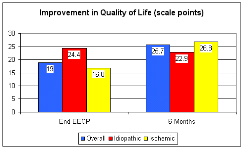 Quality of life improved following EECP; here again there was no real difference in outcome between the  prior heart attack and idiopathic heart failure patients.  For the group, the improvement was reasonably well  maintained at six months; the coronary (ischemic) patients even improved a little more over this interval.
