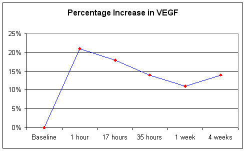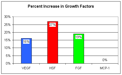 Eleven patients with angina underwent a standard, 35-hour course of EECP.  Blood levels of several angiogenic growth factors (VEGF, FGF, HSF, and MCP-1) were obtained before and following the course of EECP treatment.  The average increase in the four growth factors in this group of eleven angina patients is shown below: