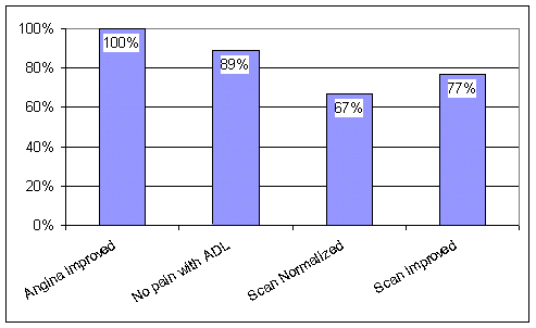 Of the 4 patients with improved angina but unimproved nuclear scans, one required bypass and another a balloon angioplasty, but the other two patients remained free of disabling angina. Of the 14 whose scans improved, two sustained events - one a heart attack and one  patient underwent bypass; one patient was lost to follow-up but the other 11 remained free of significant symptoms. 10 underwent a repeat stress nuclear scan; in 8 the scan remained improved.