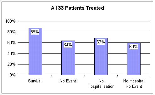Over the five year follow-up period, medication changes were permitted, and 13 of the 33 patients underwent booster session of EECP.  For the entire group, five year survival  following EECP was 88%. 31% of the patients required a  hospitalization; 14% sustained a heart attack and 21% underwent a revascularization procedure. 69% of  the patients stayed out of the hospital. Overall, 60% of the original 33 patients undergoing EECP for refractory angina were alive and well, event free, and remained out of the hospital during the five year follow-up period.