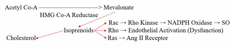 HMG Co-A Reductase generates cholesterol through a system of intermediate molecules, including the isoprenoids farnesyl and geranylgeranyl pyrophosphate. They activate the signaling molecules Rac, Rho, and Ras, which in turn upregulate superoxide free radical production (bullets to kill microbes), activate the endothelium (to allow responding white blood cells easy access to the microbes), and up regulate Angiotensin II receptor expression (more free radical production and more endothelial activation). Superoxide overload in turn promotes NF-kB translocation (our primary infection sensing inflammation up regulation pathway), to generate more pro-inflammatory cytokines (a virtuous cycle to deal with infection).