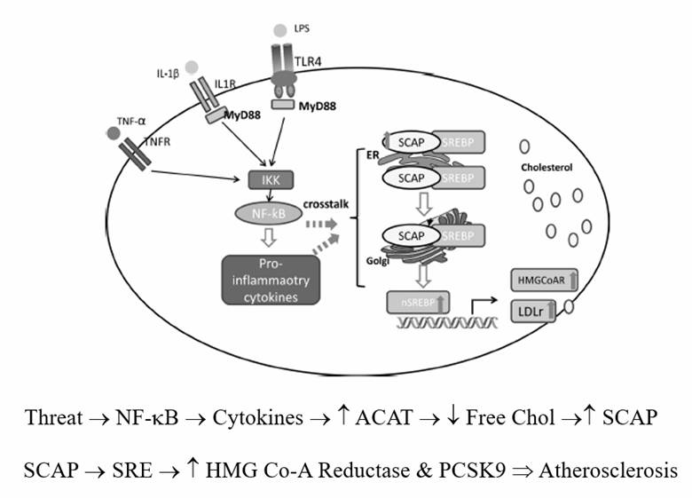 In the presence of legitimate infection (lipopolysaccharide) or inflammation (pro-inflammatory cytokines such as TNF-a or Il-1b), Acetyl Co-A Acyl Transferase (ACAT) expression up regulates, promoting cholesterol esterification (binding a free fatty acid to cholesterol, to store up these key raw materials for the upcoming infectious winter). As hepatocyte cholesterol esterification proceeds, free cholesterol falls, and as Insig senses only free cholesterol, HMG Co-A Reductase and PCSK9 transcription increase, even though total intracellular cholesterol is rising.