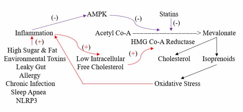 In response to legitimate infection, HMG-Co-A Reductase (the rate-limiting step in cholesterol generation) upregulates (increases its activity). This makes sense, as you need cholesterol to manufacture cell membranes for the rapidly proliferating white blood cell defenders. It also helps if you can activate the endothelium, making it easier for the defenders to access infected tissues, and to generate ROS/RNS (reactive oxygen and nitrogen species, otherwise termed “free radicals”) bullets to kill the microbes.