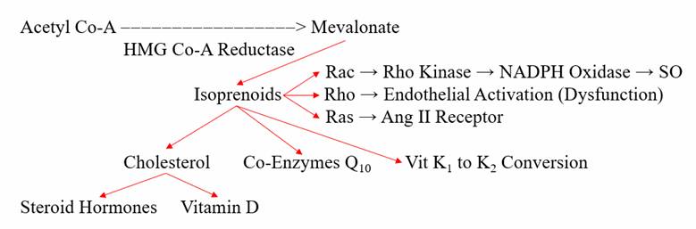 HMG Co-A Reductase is also a key step in the generation of a number of critical molecules, all of which are knocked down with statin therapy.