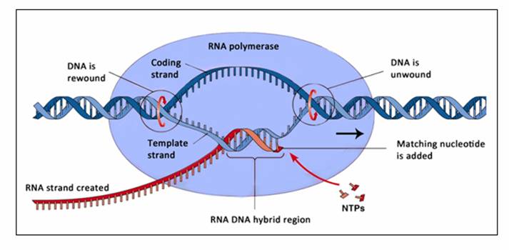 contains the DNA template), binds to a promoter (a transcription “start sign”,