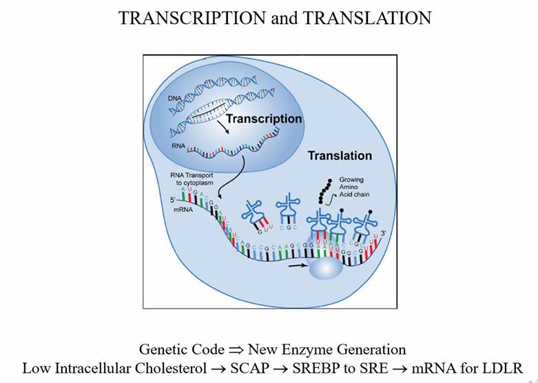 Activation of the SRE within liver cells (when intracellular free cholesterol is low) leads to transcription** of the LDL receptor protein, enabling the liver cell (hepatocyte) to pull more cholesterol out of the circulation. This is the clinical goal of statin therapy. If we inhibit HMG Co-A Reductase (what statins do), liver intracellular free cholesterol falls, SCAP will then escort SREBP to the nucleus, it binds the SRE, LDL receptors are elaborated, and the liver then pulls cholesterol out of the circulation. Thus, your serum LDL level falls.