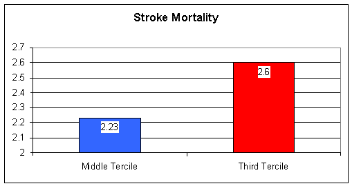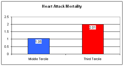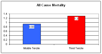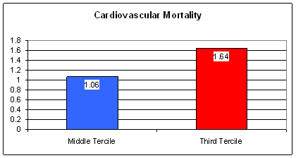 This same pathology is going on in every cell in the body. This same pathology is playing a role in the disease states that we associate with ageing, including cardiovascular disease. The NHANES (National Health and Nutrition Educational Study), measured blood lead in 13,945 American adults. The average blood level was 2.6 ug/dl. One percent of the subjects had an "abnormal" lead level of ≥ 10 ug/dl and were excluded from further analysis. The remaining subjects, with "normal" blood lead levels, were divided into terciles (33% brackets), based their blood lead levels. The lower tercile had levels between 0 and 2.0. In the middle tercile, blood lead levels ranged from 2.1 - 3.6, with levels above 3.6 in the upper tercile. All these lead levels are well within the "normal" range, but let's see what influence they had on 10 year cardiovascular death rates: