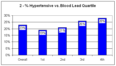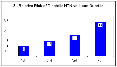 The average blood level for the entire group was 2.9 ug/dl, and the mean values for the quartiles of blood Lead ranged from 1.0 in the lowest quartile (lowest 25% bracket) to 6.3 in the highest quartile (4th quartile range 4.0 to 31 ug/dl). Thus nearly all of these healthy 40 to 59 year-old American women had blood Lead levels in the “normal” range, so what’s the problem? The problem is that while 23% of the entire group had high blood pressure, only 19% of the women in the lowest quartile for blood Lead had high blood pressure, while 28% of the women in the upper quartile for blood Lead were hypertensive (chart 2). After adjusting for differences in other factors that might affect one’s risk for hypertension, the researchers concluded that women in the 3rd and 4th quartiles for blood Lead were 30% and 40% more likely, respectively, to develop hypertension in comparison to women in the lowest quartile for blood Lead. If we look only at diastolic hypertension (the lower number), we see essentially a “dose-response” relationship between blood Lead and this condition (see chart 3).