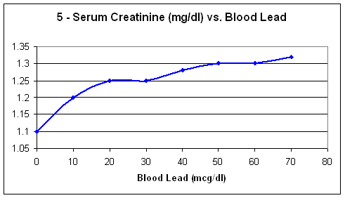 I think I’ve made my point that Lead is a primary, if not the most important, cause of hypertension in the United States. Now let’s examine the link between body Lead burden and kidney disease. The Normative Ageing Study researchers also looked at the relationship between blood Lead level in men and their level of kidney function. We measure kidney function in terms of the serum Creatinine. Creatinine is manufactured in muscle at a constant rate, released into the circulation, and then cleared from the circulation by the kidneys. Thus as kidney function declines, the serum Creatinine goes up. A normal Creatinine is <1.5 mg/dl (this may vary from lab to lab), while a Creatinine of 2 to 4 reflects moderate kidney dysfunction. Individuals with Creatinine levels in the 4 to 6 range are experiencing symptoms, and at a level above 6 mg/dl dialysis is typically necessary – so we want to see a low serum Creatinine. A rising Creatinine reflects a deteriorating kidney situation, while any intervention that causes an elevated Creatinine to fall is having an important, positive impact on your health.