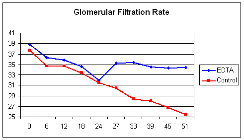 The 64 subjects involved in this study were not considered to be “Lead toxic”, at least not by standard medical criteria. None had an occupational history where Lead exposure was likely, and in all 64, their post-IV EDTA urine Lead level was <600 ug, considered to be “within normal limits”. In other words, these were individuals with kidney disease and “normal” or “not unexpected” Lead burdens. Over the first two years of this study, no action was taken, allowing the researchers to record the natural history of the kidney disease state. At the two year point, the subjects were divided at random into a placebo group, where each subject received 200 cc of salt water IV once a week over three months, or a Chelation Therapy group, where each subject received 1,000 mg of EDTA mixed in 200 cc of salt water every week until their post-EDTA urine Lead level fell to less than 60 ug. The subjects were followed for an additional two years; during this time period the placebo assigned subjects received periodic salt water placebo IVs, and the Chelation Therapy assigned subjects received IV EDTA if their post-EDTA urine Lead level remained above 60 ug. All 64 subjects received the same standard therapy appropriate to their health status. This study was double blind, meaning that neither the subjects nor the researcher knew who was getting IV salt water and who was getting IV salt water with EDTA. So what happened?