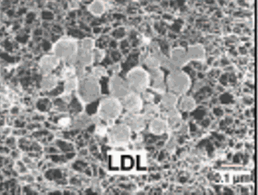 LDL cholesterol is composed of cholesterol and cholesterol ester (food), containing a small number of single use non-enzymatic antioxidants (protectors), surrounded by the apo-B 100 protein, which is studded with phosphatidylcholine molecules. The rheological characteristics of a given LDL particle relate to the status of its surface phospholipids (the initial composition of which, in turn, relates to relative dietary intake of saturated vs. unsaturated fatty acids).