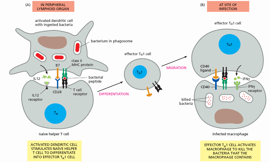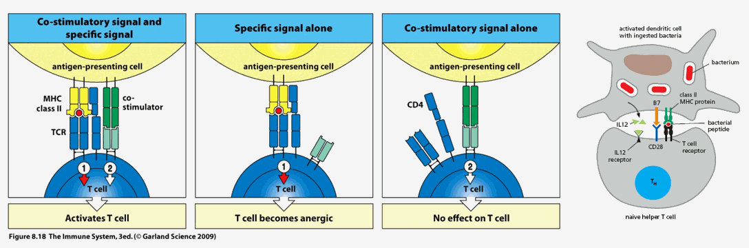 The initial immune synapse, at least one hundred "lock in key" MHC II – antigenic determinant – T cell receptor molecular couplings between the antigen presenting cell (APC) and naïve T cell, is necessary to initiate an acquired immune response directed against the specific antigenic determinant (and the microbe from which it was derived), but by itself is not sufficient. The APC must elaborate co-stimulator molecules and co-stimulatory cytokines to "fully wake up" the resting naive T cell. Stated otherwise, the APC must be "alarmed and angry" if it to fully "lock and load" the resting T cell (in this fashion, we will not mount an acquired immune response to a normal protein that was accidentally internalized by a first line defender). Interleukins released by the APC awakens the slumbering naïve T cell. As it is activating, the previously naïve T cell will likewise release cytokines to further activate the APC to stimulate its own clonal proliferation. The greater the level of mutual co-stimulation, the greater will be the level of T cell activation and clonal proliferation.