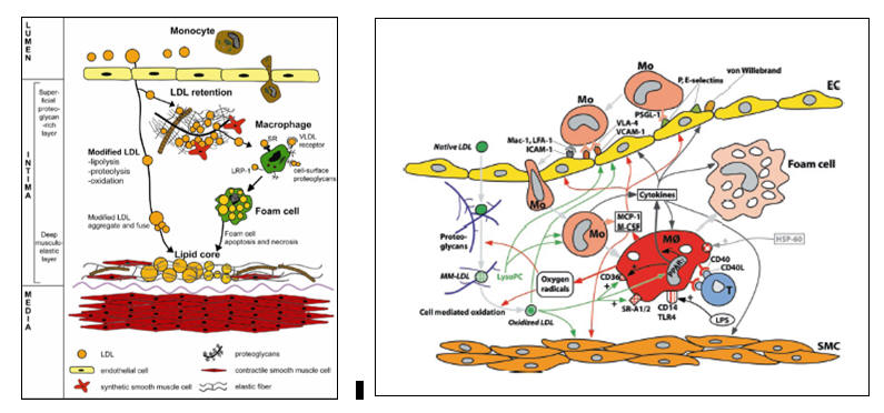 At this point we have trapped LDL molecules that are being oxidized, and an activated, nitric acid poor, endothelial surface that is non-specifically pulling in monocytes (termed macrophages upon entrance into the intima). Macrophages, as do all cells of the intima, bear LDL receptors. Oxidized LDL is not ligated by the native LDL receptor; it no longer fits. Rather the scavenger receptor expressed by mononuclear cells recognizes oxidized LDL as a microbe or cellular debris. Oxidized LDL is thus taken in. Having captured this non-native and thus threatening particle, the macrophage activates. We kill microbes with superoxide and downstream ROS and RNS, and thus their production within the macrophage is increased. More scavenger receptors are elaborated. The activated macrophage will also express non-phagocytic threat receptors (such as TLR4, the Toll-Like Receptor, and cytokine receptors), such that it can better sense its local environment and carry out its search and destroy mission. ROS that cross into the local environment serve to hasten oxidation of adjacent immobilized but not-yet-oxidized LDL particles. The activated macrophage releases chemotactic molecules (such as MCP-1, monocyte chemotactic protein), creating a chemoattractant trail to lead mononuclear cells that ligated endothelial adhesion molecules to actively translocate to the point of perceived infection, and activation signals, such as MCSF (monocyte colony stimulating factor), stimulating the translocating mononuclear cells to "lock and load", up regulating ROS/RNS generation and scavenger and threat receptor expression.