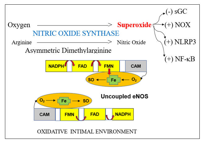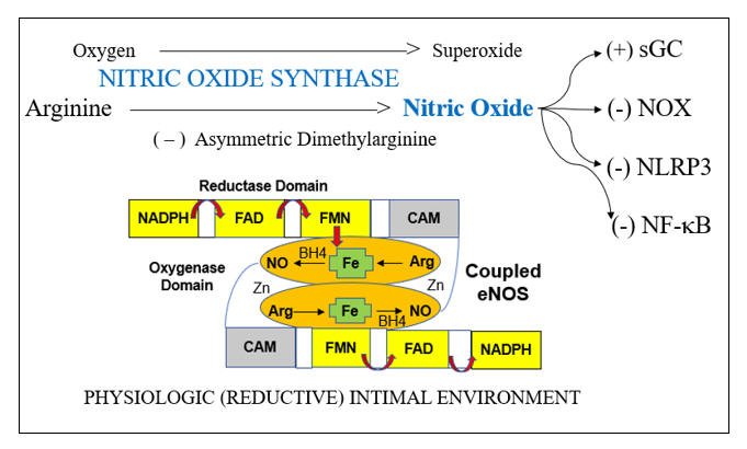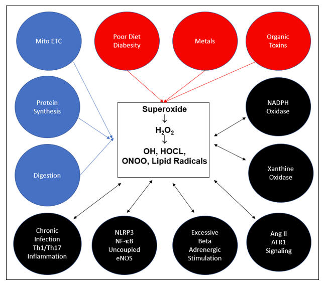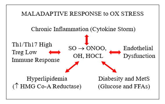 Oxidative stress (OS) occurs when the production of these reactive oxygen species (ROS) is chronically and inappropriately increased, overwhelming our innate enzyme based and dietary small molecule antioxidant defenses, allowing their conversion in to more long-lived and damaging ROS and reactive nitrogen species (RNS) such as peroxynitrite (ONOO), hydroxyl (OH), and hypochlorous acid (HOCL). When underdefended intimal ROS/RNS generation leads to endothelial activation, lipid trapping and oxidation, and secondary Th1/Th17 skewed immune dysregulation, we experience intimal oxidative distress, followed by atherosclerosis and its sequelae.