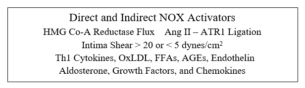 Altered (termed minimally oxidized, or MM-LDL) and now immobilized LDL particles will be subject to further oxidative alteration by free radical species generated within the sub-intimal space (initially with superoxide generated during normal oxidative metabolism and later with superoxide and secondary ROS/RNS species generated by pathologically up regulated NADPH Oxidase (NOX), Xanthine Oxidase (XO), Angiotensin II – Angiotensin Receptor type 1 (AT1R) trafficking, and HMG Co-A Reductase expression.
