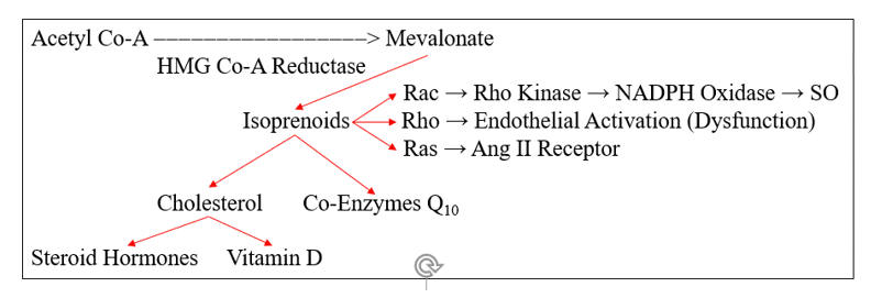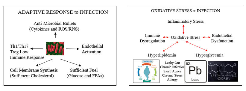 To fight infection, we need more cholesterol (leukocyte cell membrane synthesis), we need ROS and RNS "bullets" (fired by wbcs to kill the invaders), and we need an activated endothelium (expressing adhesion molecules and elaborating chemotactic signals to pull immune cells in to the breach). HMG Co-A Reductase, the rate-limiting enzyme in cholesterol biosynthesis, thus up regulates, generating copious quantities of needed cholesterol, along with isoprenoid signaling molecules, which upregulate NADPH Oxidase, our most powerful superoxide generator, and down regulate eNOS, activating the endothelium. Oxidative stress means that "we are at war"!