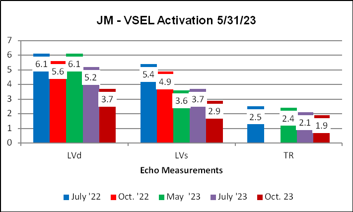 A single VSEL activation has made a difference - a huge difference!. We applied this therapy following cardiac surgery, pacemaker implantation, and a full complement of pharmaceutical and nutritional intervention (all we had to offer). Additional VSEL activation can be carried out at JM's discretion, and we will continue to monitor JM's echo status and pro-BNP levels. 12/22/23