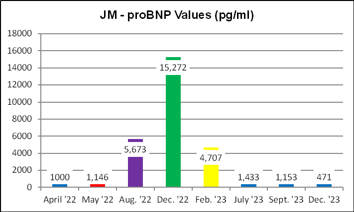 Biventricular pacemaker placement made sense, hoping to improve the mechanical efficiency of JM's left ventricle. This procedure was carried out in the fall of '22, but two months later, in 12/22, JM's pro-BNP was up further, to 15,272. Pentoxifylline (immune modulator helpful in CHF of any cause) and Famotidine (to block the deleterious effects of histamine on the failing heart) were added, and adjustments were made in JM's neuroendocrine blockade and diuretic program. By 2/23, pro-BNP had decreased to 4,707.